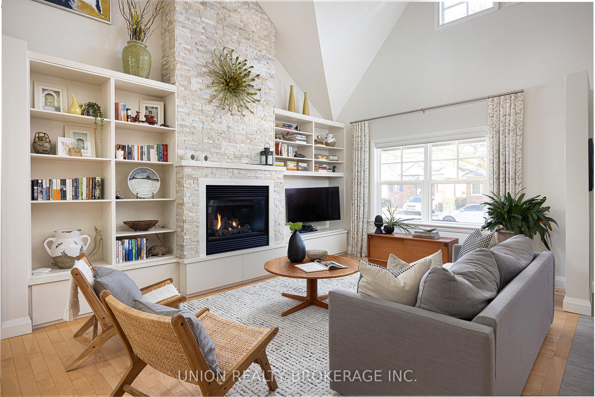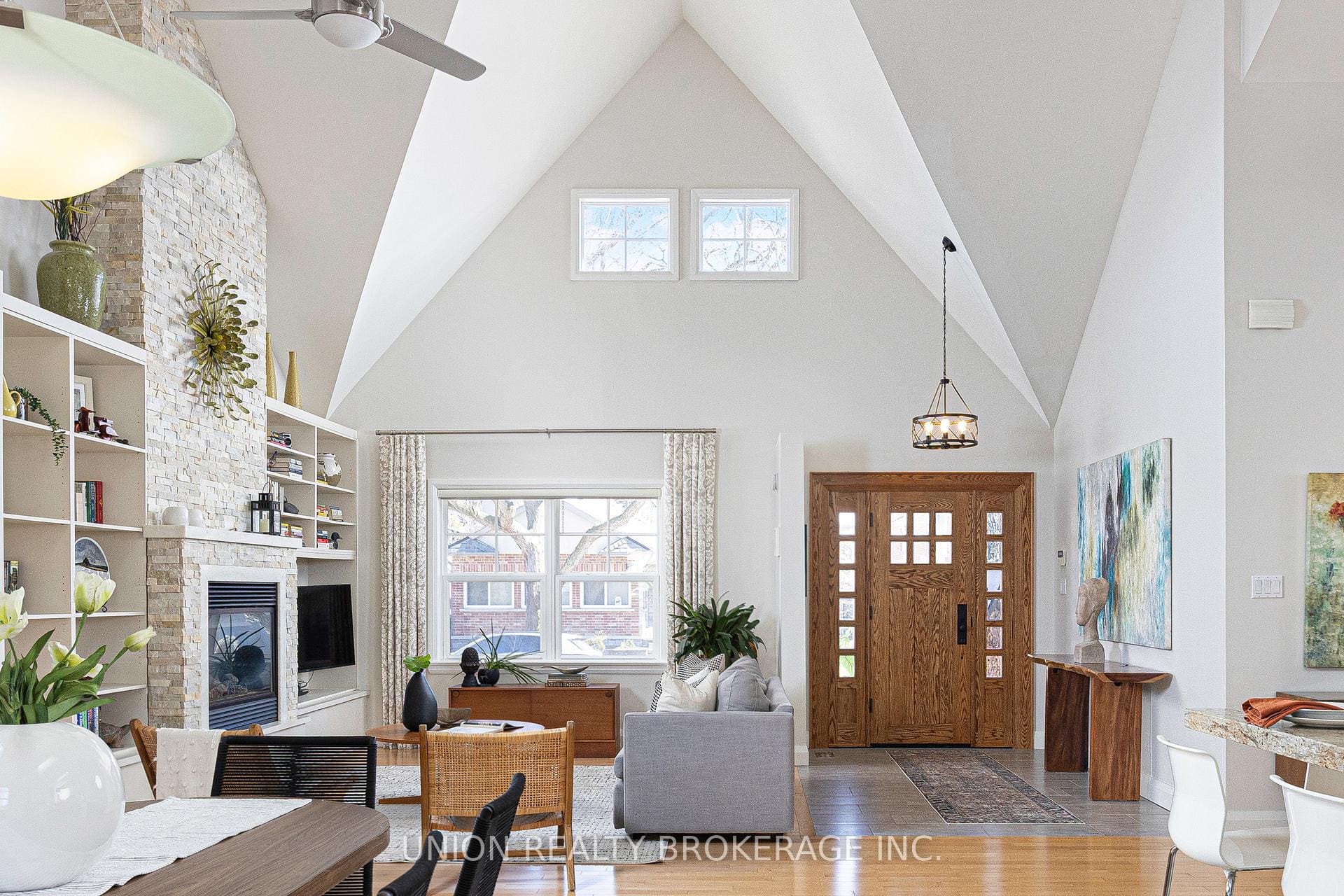 The main floor is defined by soaring 25’ vaulted ceilings that carry through the principal living spaces, creating a dramatic yet welcoming setting. The open-concept kitchen, dining and living areas offer an inviting space for both everyday living and entertaining. Complemented by a conveniently located guest bath. The main-floor primary suite features a private ensuite and walkout to a wrap-around cedar porch overlooking beautifully landscaped gardens, a peaceful retreat. A well-positioned mudroom adds everyday functionality with practical access to the gardens.