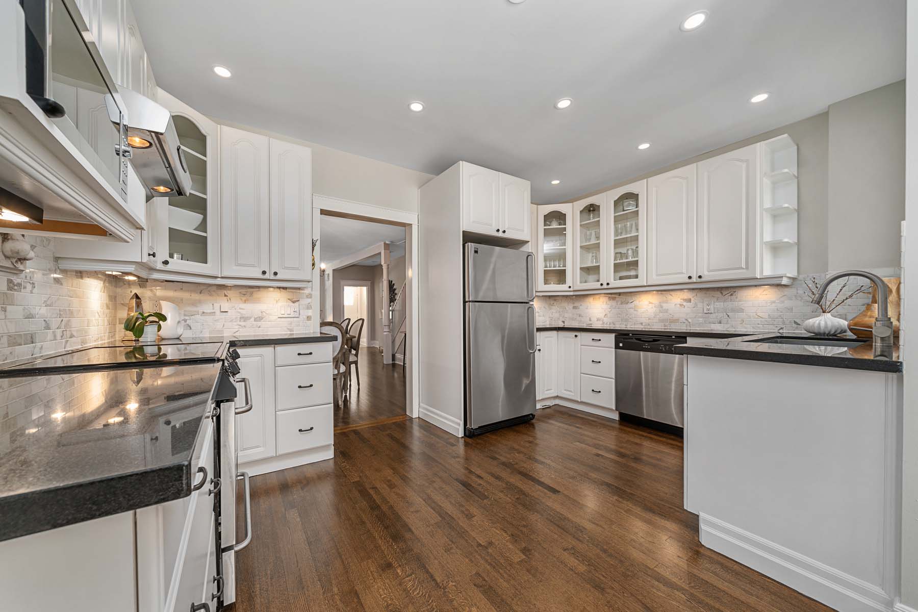 Set back from street with great curb appeal and charming front porch. Larger than it looks, four bedroom family home. Renovated kitchen with built-in bench seating and walk out to stone patio and private backyard. Hardwood throughout, pot lights, wood burning fireplace with built-ins, large master with ensuite bath and his and her closets, large third floor walk out to deck, finished basement, two car parking. Steps to Queen Street and boardwalk. Balmy Beach and Malvern school district.
