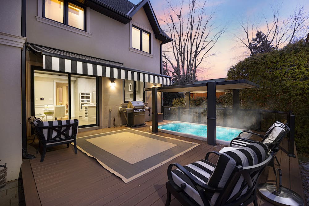 Custom built Bluffs home spanning over 4,000 sq. ft. of luxury! Set back on a generous 50 foot frontage, with landscaped grounds, an interlocked stone driveway offering ample parking, and a double car garage with epoxy flooring. Step in to this pristine residence boasting thoughtful design, detailed millwork, and quality craftsmanship throughout. The welcoming foyer entry with high ceilings, elevates the home’s interior appeal, opening up to an elegant living and dining area with ample closet space and a main floor powder room. The exquisite gourmet kitchen overlooks a main floor family room with a walkout to serene views of the private backyard providing an outdoor retreat, complete with composite decking, a retractable awning, SwimSpa, glass railings, and lush, low-maintenance landscape. Convenient direct access to the home from the garage, a separate side entrance that walks down to the completely finished lower is perfect for an in-law suite with an extra bedroom, or an extension of luxury living and entertaining. The upstairs landing is sun-filled with a skylight and leads to four spacious bedrooms including a grand primary, each with ensuite or semi-ensuite bath. A second-floor laundry room adds functionality and simplicity. Notable upgrades include a whole-home generator, advanced security and camera system, programmable lighting, central vac, triple sump pump with battery backup, and high-capacity HVAC. A rare opportunity to enjoy a peaceful, nature-filled lifestyle just steps to parkland and tennis courts. Minutes to Rosetta McClain Gardens, Kingston Road amenities, and top-rated schools including Chine Drive PS and R.H. King Academy.